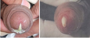 淋病:尿道口红肿瘙痒、外翻,产生大量脓性分泌物,尿道中可见淋丝或血液,晨起时尿道口可结脓痂。